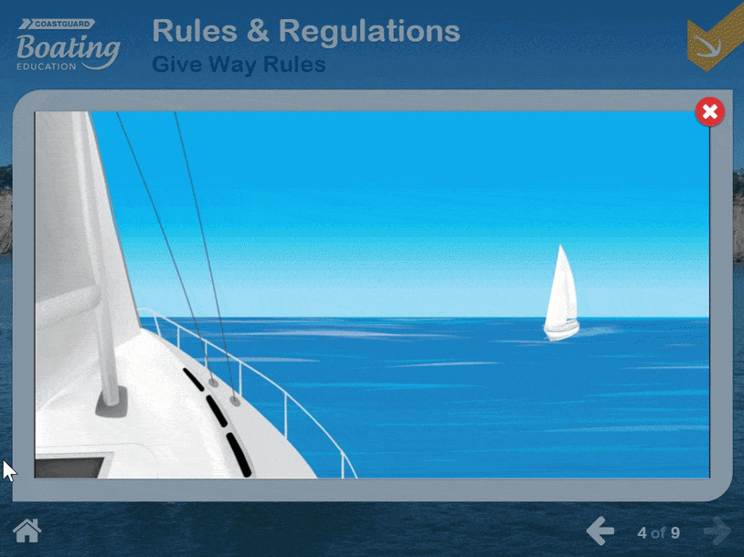 We built the programme around immersive, scenario-based interactions that put learners in realistic boating situations. Rather than presenting rules as abstract theory, learners had to apply them in context, navigating decisions around right of way, collision avoidance, and vessel handling.